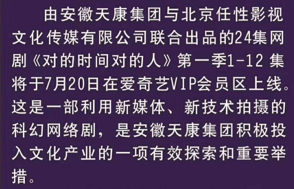 最近,安徽天康集團與影視公司聯(lián)合出品了24集的網(wǎng)絡劇,據(jù)介紹,這是一部利用新媒體、新技術(shù)拍攝的科幻網(wǎng)絡劇,是安徽天康集團積極投入文化產(chǎn)業(yè)的一項有效探索和重要舉措。