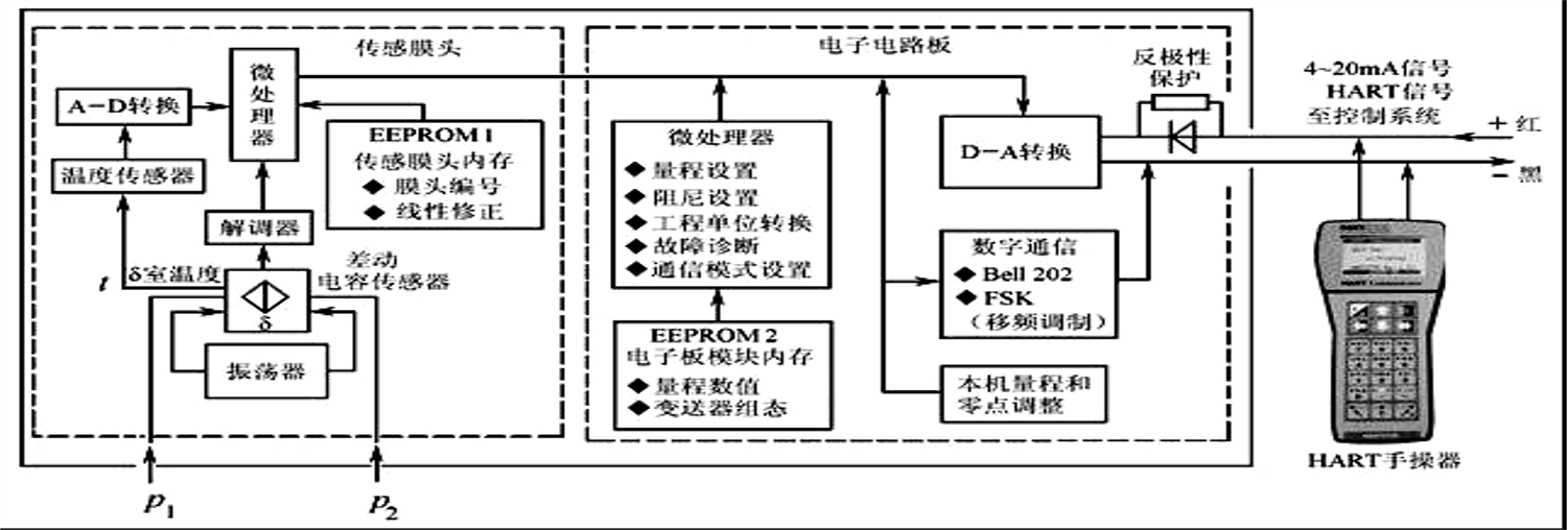 智能差壓變送器的工作原理框圖帶有液晶顯示器,與手持終端配合,可以在現(xiàn)場變送器的信號端子上,就地設(shè)定零點(diǎn)、量程;也可以在遠(yuǎn)離現(xiàn)場的控制室中,或遠(yuǎn)離危險(xiǎn)的地方,將智能手持終端接到某個(gè)變送器的信號線上,進(jìn)行遠(yuǎn)程組態(tài)、測量范圍變更、變送器校準(zhǔn)、故障自診斷。